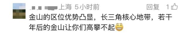 还有人看好金山的发展:这次金山要起飞了吧!区位优势直接凸显,长三角核心地带,若干年后的金山让你们高攀不起。