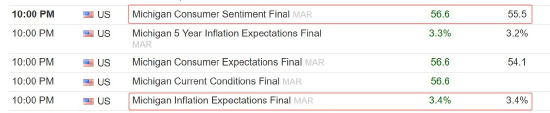 本周五22:00,将会有两项关于美国通胀率的重磅数据发布,分别是:美国3月密歇根大学消费者信心指数、美国3月一年期通胀率预期终值。两项数据的发布机构都是密歇根大学,公布的都是终值,也就是初值的调整结果。