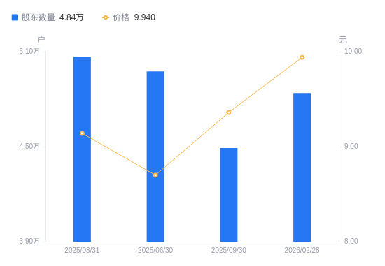 3月23日消息,数据显示,截至2026年2月28日,A股股东总户数为4.84万户,较上期(2025年9月30日)增加3479户,增幅7.75%。公司最新A股总股本为5.42亿股,其中流通A股5.42亿股,户均持有流通A股数量为1.12万股,较上期减少867.36股,降幅7.19%;户均持流通A股市值11.13万元,较上期减少1624元,降幅1.44%。