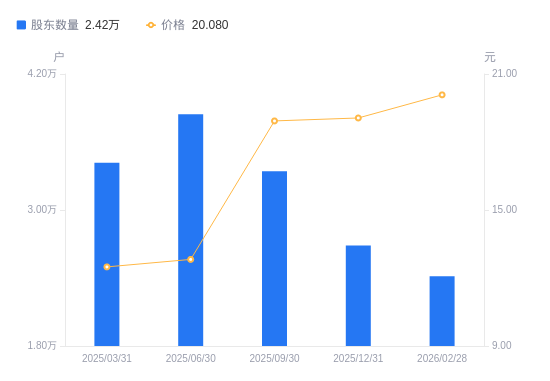 3月23日消息,数据显示,截至2025年12月31日,A股股东总户数为2.69万户,较上期(2025年9月30日)减少6556户,降幅19.62%。公司最新A股总股本为7.87亿股,其中流通A股6.98亿股,户均持有流通A股数量为2.6万股,较上期增加5099.61股,增幅24.41%;户均持流通A股市值49.54万元,较上期增加9.99万元,增幅25.26%。