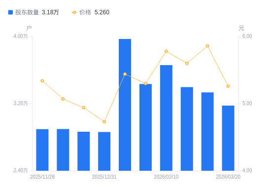 3月23日消息,数据显示,截至2026年3月20日,A股股东总户数为3.18万户,较上期(2026年2月28日)减少1572户,降幅4.72%。公司最新A股总股本为3.93亿股,其中流通A股3.41亿股,户均持有流通A股数量为1.07万股,较上期增加505.82股,增幅4.95%;户均持流通A股市值5.64万元,较上期减少3471.95元,降幅5.80%。