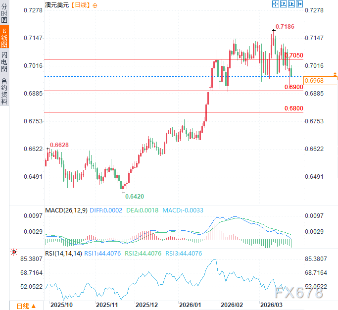 汇通财经APP讯——周二(3月24日)亚市时段,表现疲软,兑主要货币普遍走低,震荡走低,目前该货币对交投于0.6970附近,日内跌幅约0.6%。伊朗方面强硬否认与美国进行和平谈判,与美国总统特朗普此前乐观表态形成鲜明对比,重燃市场风险厌恶情绪,导致澳元承压。风险偏好下降提振美元表现,小幅回升至99.40附近,日内涨幅约0.2%。澳元作为典型的风险敏感货币,在地缘不确定性加剧时往往面临较大卖压。