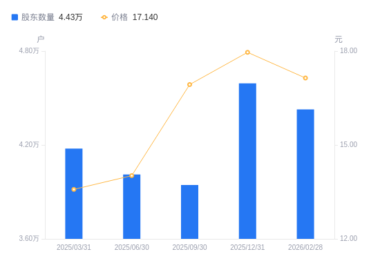 3月24日消息,数据显示,截至2026年2月28日,A股股东总户数为4.43万户,较上期(2025年12月31日)减少1670户,降幅3.63%。公司最新A股总股本为11.17亿股,其中流通A股11.09亿股,户均持有流通A股数量为2.51万股,较上期增加910.66股,增幅3.77%;户均持流通A股市值42.94万元,较上期减少4188元,降幅0.97%。