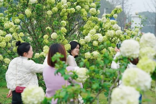 3月24日,长沙市开福区芙蓉北路盛世路口街角花园,市民在木绣球花海中打卡留影。近期,这里的中华木绣球花蓬勃绽放,嫩绿的花苞渐次晕染成雪白,层层叠叠的花团簇拥在枝头,勾勒出一幅惬意的春日美景。