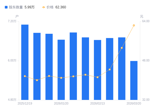 3月24日消息,数据显示,截至2026年3月20日,A股股东总户数为5.99万户,较上期(2026年3月10日)减少7200户,降幅10.73%。公司最新A股总股本为4.65亿股,其中流通A股4.64亿股,户均持有流通A股数量为7752.16股,较上期增加831.83股,增幅12.02%;户均持流通A股市值48.34万元,较上期增加11.53万元,增幅31.31%。