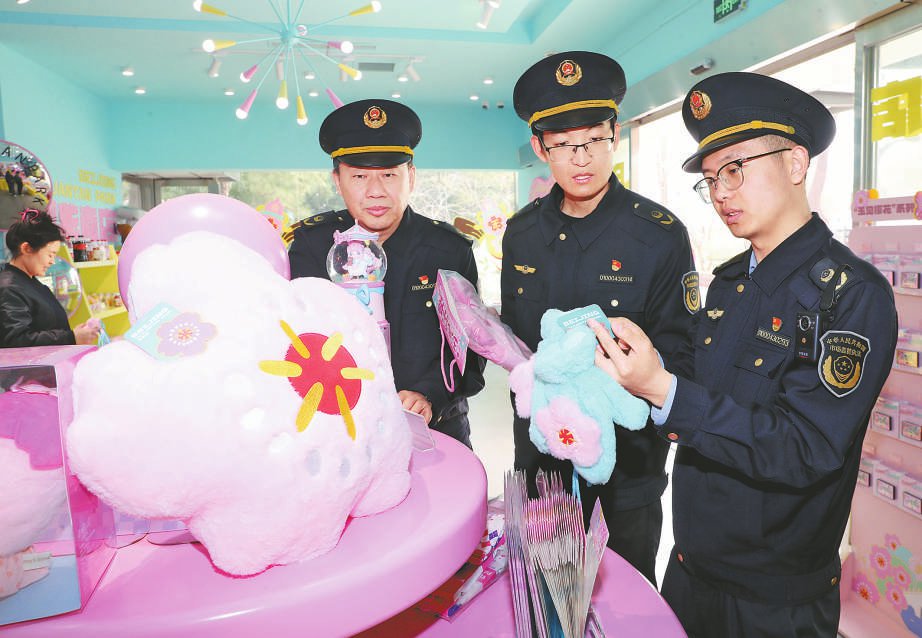 近日,北京市海淀区市场监管局对旅游纪念品和工艺品的产品质量、产品供应、进销台账、知识产权授权等进行检查,并随机抽查相关产品的合格证明、检测报告等,确保产品质量安全。图为执法人员在北京玉渊潭公园樱花文化节上对文创产品进行检查。本报记者董芳忠摄影报道