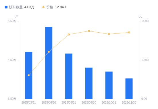 3月27日消息,数据显示,截至2025年12月31日,A股股东总户数为3.9万户,较上期(2025年11月30日)减少1246户,降幅3.09%。公司最新A股总股本为8亿股,其中流通A股7.99亿股,户均持有流通A股数量为2.05万股,较上期增加633.47股,增幅3.19%;户均持流通A股市值26.72万元,较上期增加1.24万元,增幅4.88%。