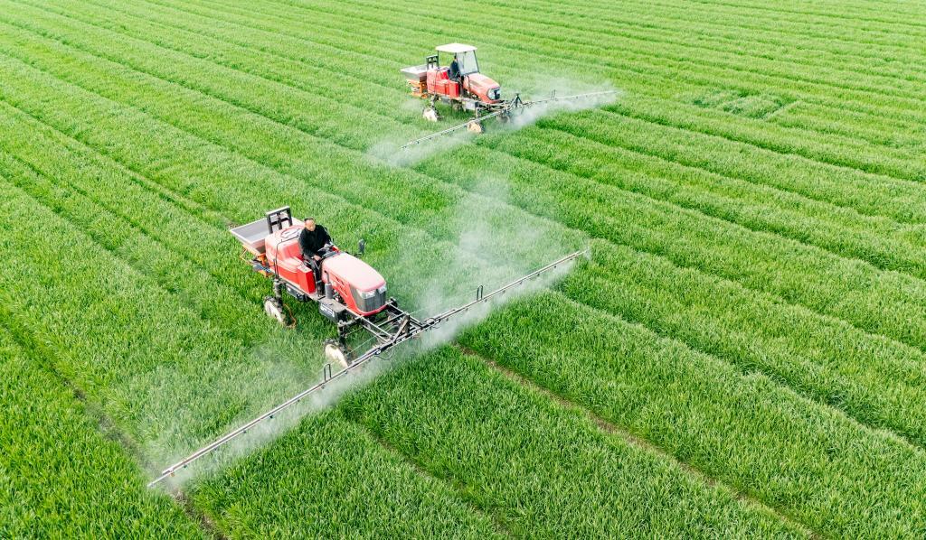 3月13日,在江苏省兴化市陈堡镇蒋庄村,农民驾驶植保无人机、自走式喷杆喷雾机实施杂草防治作业。新华社发