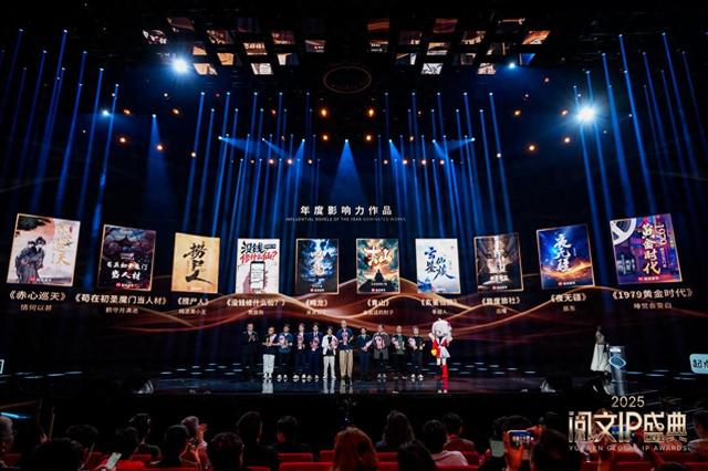 盛典现场,2025“年度影响力作品”揭晓,《捞尸人》《苟在初圣魔门当人材》《没钱修什么仙?》《夜无疆》《玄鉴仙族》《异度旅社》《赤心巡天》《青山》《1979黄金时代》《鸣龙》等十部佳作上榜。这些作品覆盖悬疑、仙侠、科幻、历史、现实等多元题材,彰显阅文内容生态的源头活力与精品实力。