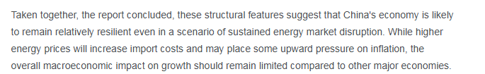 报告总结称,即便能源市场持续动荡,中国受冲击程度也将明显轻于其他主要经济体。虽然能源价格上涨可能推升进口成本并产生一定通胀压力,但对整体经济增长的宏观影响将保持可控。