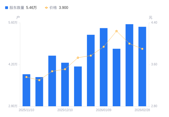3月30日消息,数据显示,截至2026年2月28日,A股股东总户数为5.46万户,较上期(2026年1月30日)减少876户,降幅1.58%。公司最新A股总股本为18.35亿股,其中流通A股13.25亿股,户均持有流通A股数量为2.43万股,较上期增加382.81股,增幅1.60%;户均持流通A股市值9.46万元,较上期减少894.41元,降幅0.94%。