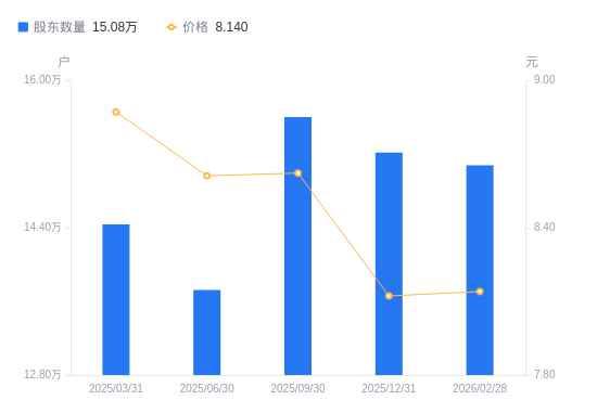 3月30日消息,数据显示,截至2026年2月28日,A股股东总户数为15.08万户,较上期(2025年12月31日)减少1393户,降幅0.92%。公司最新A股总股本为118.56亿股,其中流通A股117.78亿股,户均持有流通A股数量为7.81万股,较上期增加715.21股,增幅0.92%;户均持流通A股市值63.59万元,较上期增加7215.14元,增幅1.15%。