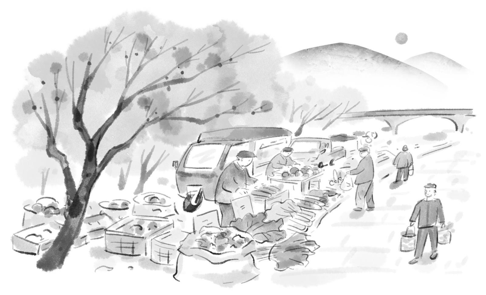 未到宁溪大桥,耳畔便被各种声响填满。高音喇叭单句循环的叫卖声、车声、人声混合在一起。“人声鼎沸”,应该就是形容这样闹哄哄的场景吧。走上桥头,才看清各种各样的摊点将桥的两侧挤得满满当当。开着电动三轮车或者小货车来的,通常是外地商贩,售卖豫地的铁棍山药、鲁地的苹果等,常常大着嗓门吆喝。苦于语言沟通不便,有的干脆挂出纸板,直接写明价格。