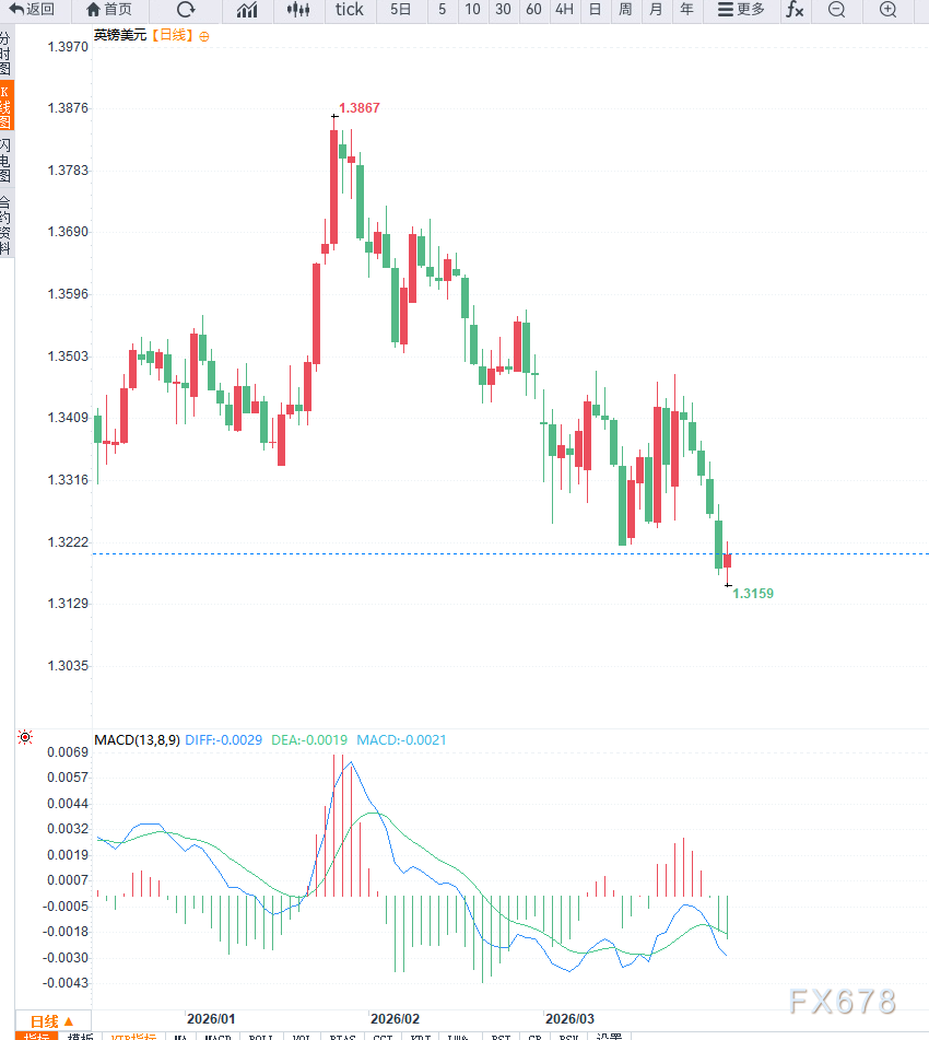 从技术面来看,日线级别上,英镑兑美元整体处于下降趋势之中,价格持续运行于下行通道内,短期虽在1.3150附近获得支撑并出现反弹,但趋势尚未扭转。上方关键阻力位关注1.3250及1.3320区域,若无法有效突破,反弹空间将受限。动能指标方面,RSI自超卖区域回升,但仍处于弱势区间,MACD在零轴下方运行,显示空头趋势仍占主导。目前仍处于下行趋势中的反弹阶段,短期以震荡修复为主,趋势性反转尚未确认。