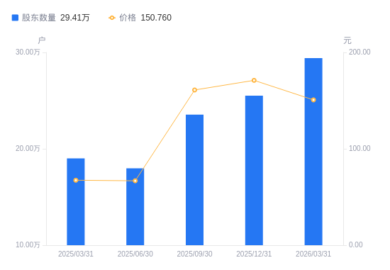 3月31日消息,数据显示,截至2026年3月31日,A股股东总户数为29.41万户,较上期(2025年12月31日)增加3.9万户,增幅15.29%。公司最新A股总股本为20.73亿股,其中流通A股15.9亿股,户均持有流通A股数量为5404.44股,较上期减少826.59股,降幅13.27%;户均持流通A股市值81.48万元,较上期减少25.1万元,降幅23.55%。