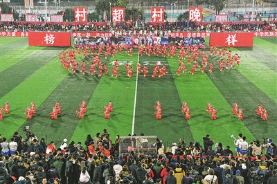 1月2日,第四届贵州“村超”开幕式暨“村超村晚”活动在榕江县举行。“村超”参赛队从2023年第一届的20支增至本届的137支,“百村大战”规模升级。图为学生在活动现场表演。 新华/传真