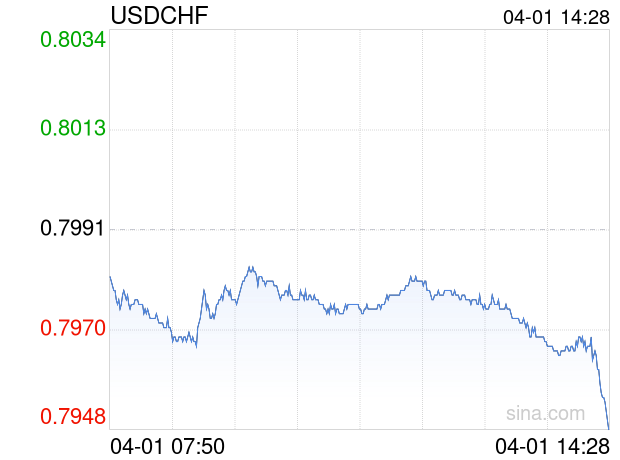 新浪外汇消息2026年04月01日,截至14时28分,外汇市场上美元兑瑞士法郎汇率跌破1美元兑换0.7946瑞士法郎。跌幅为-0.5631%