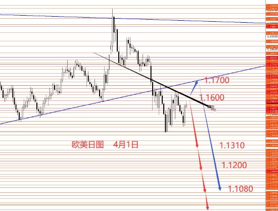 三月正如预期震荡下行至1.1410区域。从图形来看,欧元还在区间震荡,后市中线1.1680以下继续看跌。本月上方重点关注1.1680强阻力,以下看跌,若后市成功站稳上方则需重新分析,这个框架就不能要了。本周操作建议:1.1600附近做空,止损1.1670,目标看向1.1310和1.1200,再看向1.1030和1.0870区域。本周红线概率较大些,蓝线做为备选方案。控制仓量,严格止损。