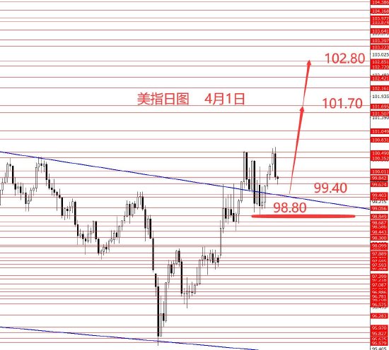 4月1日,上个月震荡上行,月线收大阳柱。从图形来看,美指中线反弹行情正如预期,而且这波行情还没走完,本月继续上行的概率较大些,下方关注98.80强支撑,以上中线继续看涨。若跌回至98.80下方则重新分析重新来过。操作建议99.40附近做多,止损98.70,目标看向101.70和102.80区域。控制仓量,严格止损。