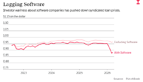 投资者对人工智能给软件行业带来威胁的焦虑情绪,打击的不仅是软件类股票。据 PitchBook 数据显示,3 月份投资者愿意为软件企业的银团银行债务支付的价格同比下跌近 7%,而其他行业同类贷款价格仅小幅下滑。