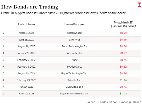 与此同时,2020 年以来为资助一系列大型软件收购而发行的债券也出现贬值,不过这一现象与人工智能焦虑的关联较小,更多是受利率环境影响。