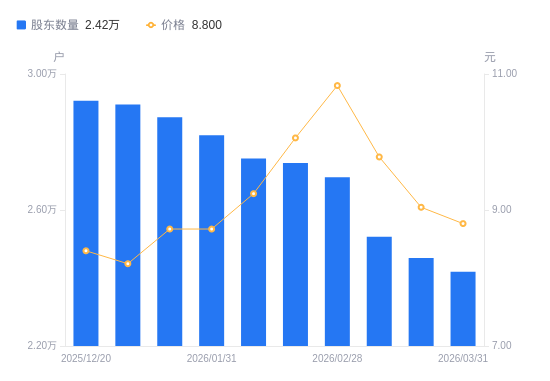 3月31日消息,数据显示,截至2026年3月31日,A股股东总户数为2.42万户,较上期(2026年3月20日)减少408户,降幅1.66%。公司最新A股总股本为4.65亿股,其中流通A股4.65亿股,户均持有流通A股数量为1.92万股,较上期增加318.92股,增幅1.69%;户均持流通A股市值16.91万元,较上期减少1729.88元,降幅1.01%。