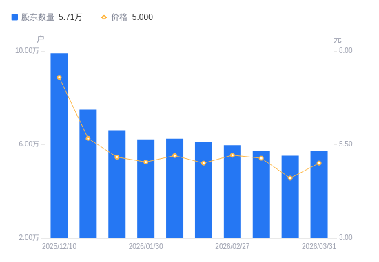 4月1日消息,数据显示,截至2026年3月31日,A股股东总户数为5.71万户,较上期(2026年3月20日)增加1981户,增幅3.59%。公司最新A股总股本为4.66亿股,其中流通A股4.65亿股,户均持有流通A股数量为8150.33股,较上期减少292.86股,降幅3.47%;户均持流通A股市值4.08万元,较上期增加1912.96元,增幅4.93%。