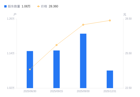 4月2日消息,数据显示,截至2025年12月31日,A股股东总户数为1.08万户,较上期(2025年9月30日)减少1278户,降幅10.57%。公司最新A股总股本为1.43亿股,其中流通A股1.02亿股,户均持有流通A股数量为9401.63股,较上期增加996.86股,增幅11.86%;户均持流通A股市值26.66万元,较上期增加3.14万元,增幅13.34%。