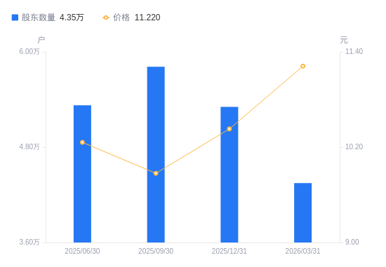 4月2日消息,数据显示,截至2026年3月31日,A股股东总户数为4.35万户,较上期(2025年12月31日)减少9611户,降幅18.11%。公司最新A股总股本为15.92亿股,其中流通A股14.71亿股,户均持有流通A股数量为3.38万股,较上期增加6125.96股,增幅22.11%;户均持流通A股市值37.96万元,较上期增加9.06万元,增幅31.36%。