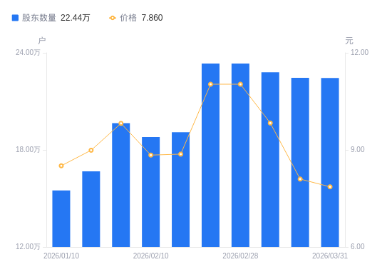 近一年(2025年3月31日至2026年3月31日),驰宏锌锗A股股东户数从17.06万户,增加至22.44万户,增幅31.54%,区间股价上涨45.26%。