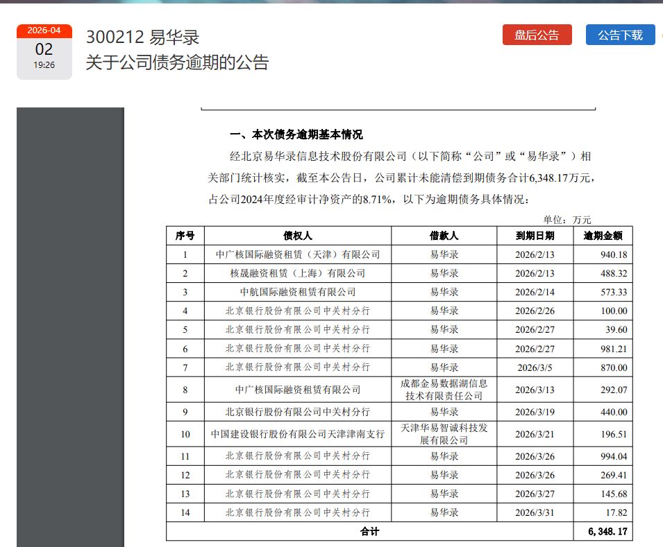 继年初发布巨额亏损预警后,央企中国电科旗下的(SZ300212,股价10.74元,市值77.32亿元)再次曝出财务困境。4月2日晚间,易华录发布公告,披露公司及两家子公司累计未能清偿到期债务合计6348.17万元,占公司2024年度经审计净资产的8.71%。