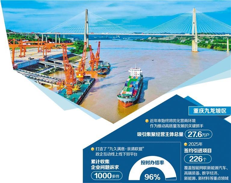 今年以来,重庆市九龙坡区的企业车间和项目工地,处处可见热火朝天的生产和建设场景。作为重庆工业大区,九龙坡区近年来始终将优化营商环境作为推动高质量发展的关键抓手,聚焦政务服务、营商环境、法治环境等重点领域持续发力,营商环境评价连续多年排名重庆市前列,吸引集聚经营主体总量达27.6万户。