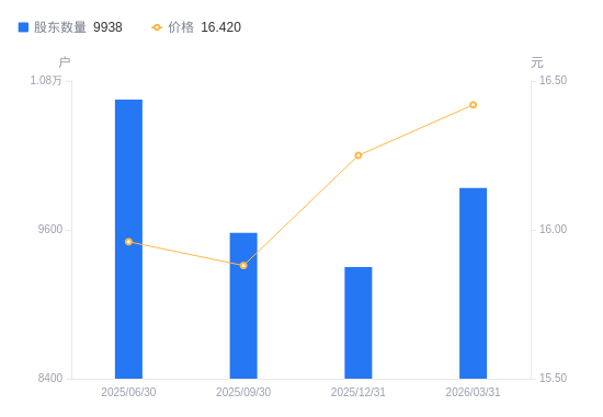 4月3日消息,数据显示,截至2025年12月31日,A股股东总户数为9300户,较上期(2025年9月30日)减少276户,降幅2.88%。公司最新A股总股本为1.12亿股,其中流通A股7105.54万股,户均持有流通A股数量为7640.37股,较上期增加220.21股,增幅2.97%;户均持流通A股市值12.42万元,较上期增加6323.89元,增幅5.37%。
