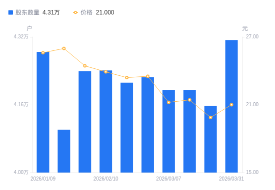 4月3日消息,数据显示,截至2025年12月31日,A股股东总户数为4.26万户,较上期(2025年12月19日)减少863户,降幅1.99%。公司最新A股总股本为5.43亿股,其中流通A股4.99亿股,户均持有流通A股数量为1.17万股,较上期增加232.79股,增幅2.03%;户均持流通A股市值27.23万元,较上期增加471.75元,增幅0.17%。