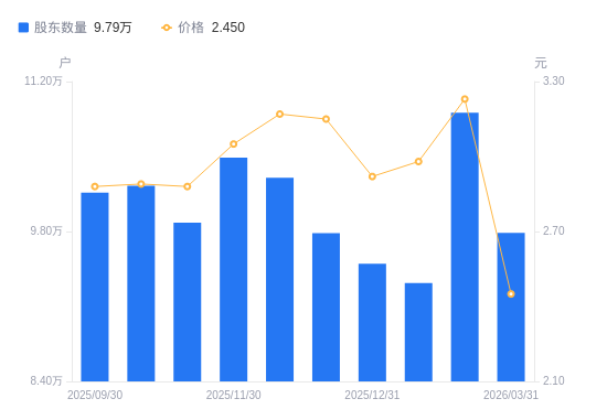 4月1日消息,数据显示,截至2026年3月31日,A股股东总户数为9.79万户,较上期(2026年1月20日)减少1.12万户,降幅10.28%。公司最新A股总股本为62.27亿股,其中流通A股58.98亿股,户均持有流通A股数量为6.03万股,较上期增加6193.55股,增幅11.46%;户均持流通A股市值14.76万元,较上期减少2.7万元,降幅15.46%。