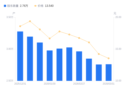 4月3日消息,数据显示,截至2026年3月31日,A股股东总户数为2.76万户,较上期(2026年3月20日)增加34户,增幅0.12%。公司最新A股总股本为5.06亿股,其中流通A股5.06亿股,户均持有流通A股数量为1.83万股,较上期减少22.61股,降幅0.12%;户均持流通A股市值24.82万元,较上期减少1.28万元,降幅4.90%。