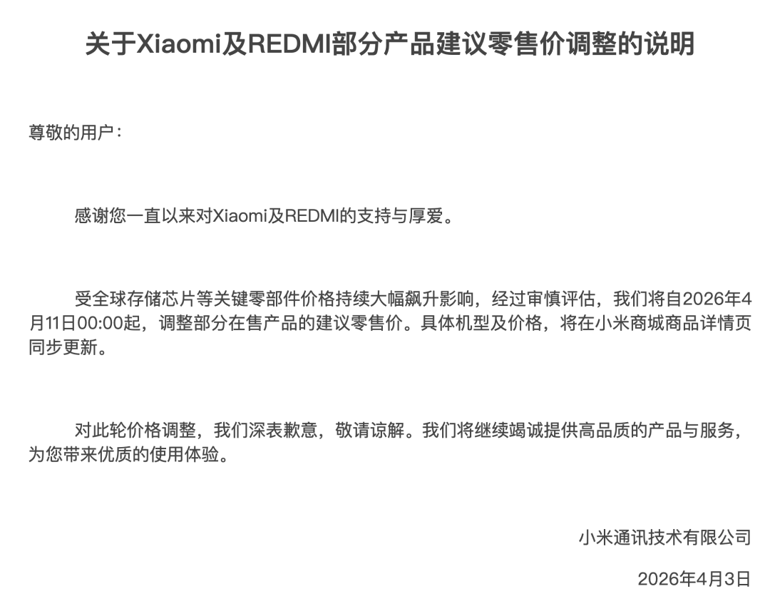 如上图所见,小米官网更新了一则关于Xiaomi及REDMI部分产品建议零售价调整的说明,表示「受全球存储芯片等关键零部件价格持续大幅飙升影响,经过审慎评估,我们将自2026年4月11日00:00起,调整部分在售产品的建议零售价。具体机型及价格,将在小米商城商品详情页同步更新。」