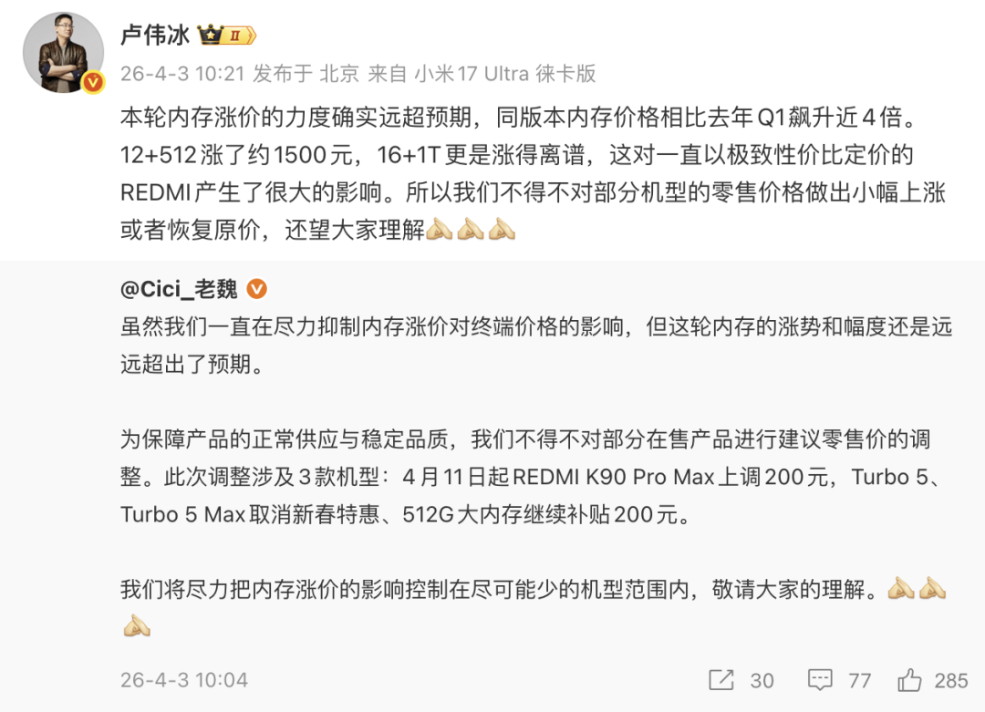 具体价格调整主要是红米三款产品,小米卢伟冰和魏思琪均更新微博进行了说明:「4月11日起REDMI K90 Pro Max上调200元;Turbo 5、Turbo 5 Max取消新春特惠,512G大内存继续补贴200元。」 打算入手的小伙伴可以趁涨价前及时入手~