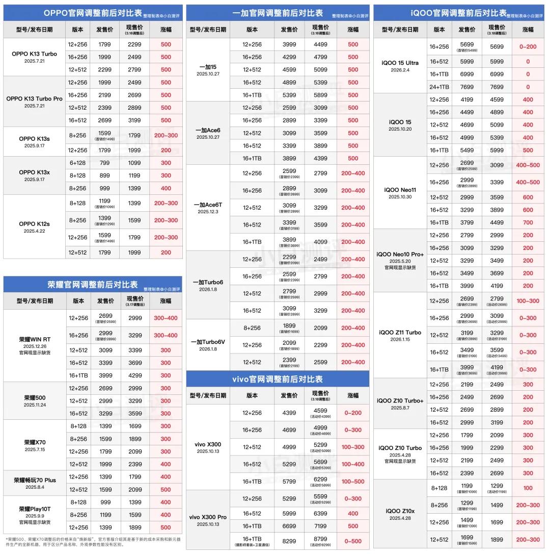 作为补充,附上之前制作的OPPO、vivo、荣耀价格调整机型。今年这波内存存储涨价潮预计还要持续很长一段时间,如果不是着急换机的小伙伴也可以适当延长换机周期多等等。