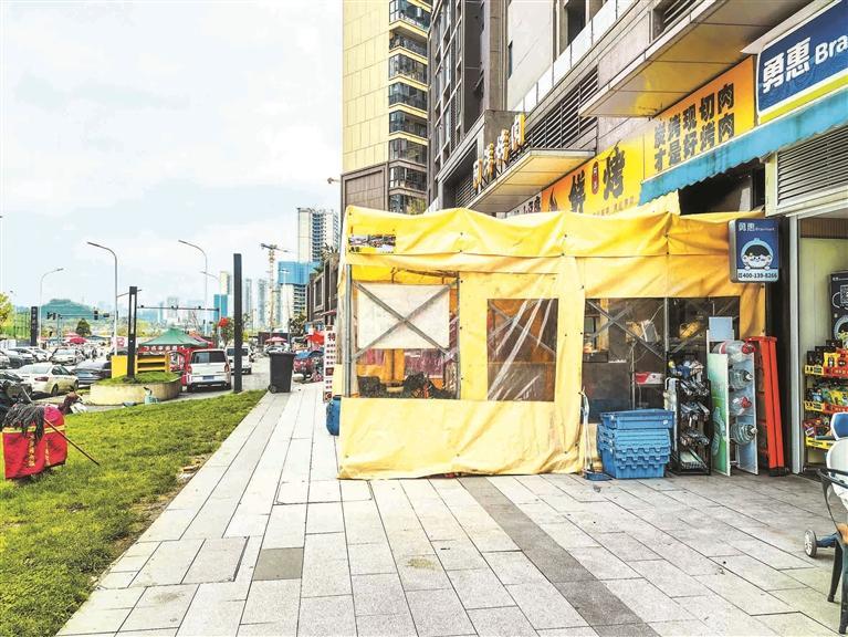 北门左侧原本宽约5米的人行道上,多家商铺将大型伸缩雨棚完全展开,向人行道延伸出去。雨棚下方,有的堆放着桌椅,有的则直接空置着“圈地”。整条人行道被雨棚和经营物品挤占后,留给行人通行的宽度仅剩约1米。