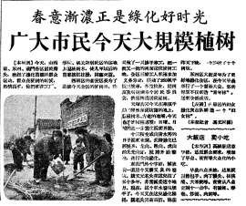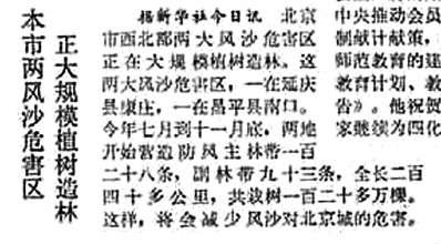 风沙紧逼北京城,多种一棵树,少落一粒沙。1979年,3月12日被确立为我国的植树节。1981年,全国人大通过决议,号召每人每年义务植树三至五棵。北京开始了更大规模的绿化。每到春夏,各单位组织植树,很多山头红旗招展,回荡着劳动号子的声音。