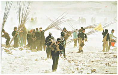 4月14日一大早,一千余名《北京晚报》的读者,向距北京70公里的丰宁进发……这一天,丰宁山谷里刮起了7级大风,从孩子到老人没有一个退缩,共挖树坑5000多个,植树5200多株。(2001年4月15日《北京晚报》3版《风吼沙啸植树忙》、1版《任凭沙大 志愿者旗帜如画》)