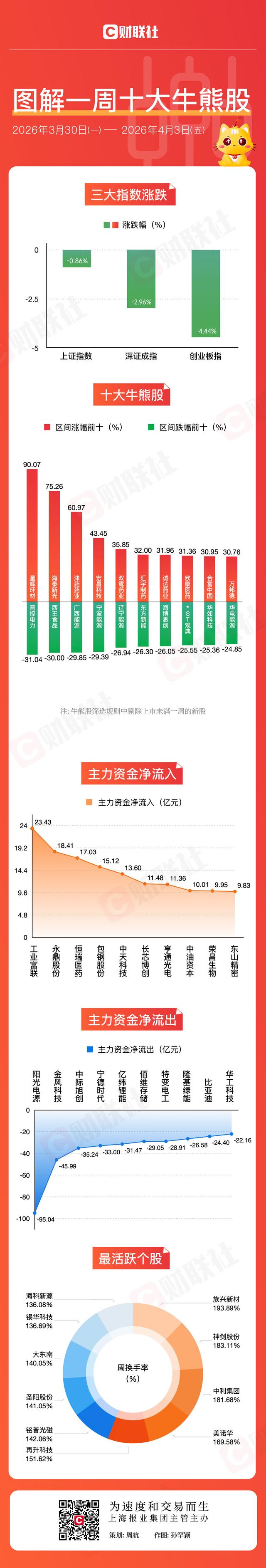财联社4月4日讯,本周A股三大指数震荡回调,其中上证指数周跌0.86%,深成指周跌2.96%,创业板指周跌4.44%,本周市场成交量较上周缩量明显。本周化学制药、生物制品、医疗服务板块涨幅居前,创新药、光纤概念股表现活跃。