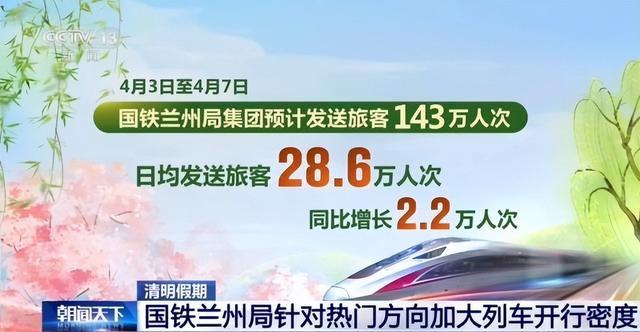 中国铁路兰州局集团清明假期运输预计发送旅客143万人次,日均发送旅客28.6万人次,同比增长2.2万人次。整体客流以短途探亲、祭扫、近郊踏青为主。