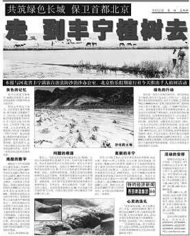 植树造林开始走出北京。2001年3月,北京晚报联合河北省丰宁满族自治县防沙治沙办公室等单位发起“共筑绿色长城,保卫首都北京”千人植树活动,计划至少营造70亩共4000余株的“首都志愿者保护林”。植树地点就选在北京三大风口之一的丰宁。(2001年3月9日《北京晚报》1版《到丰宁植树去》)活动原定组织一千人,但要求参加者络绎不绝,北京晚报临时决定再增加一千人,分两批前往丰宁植树。