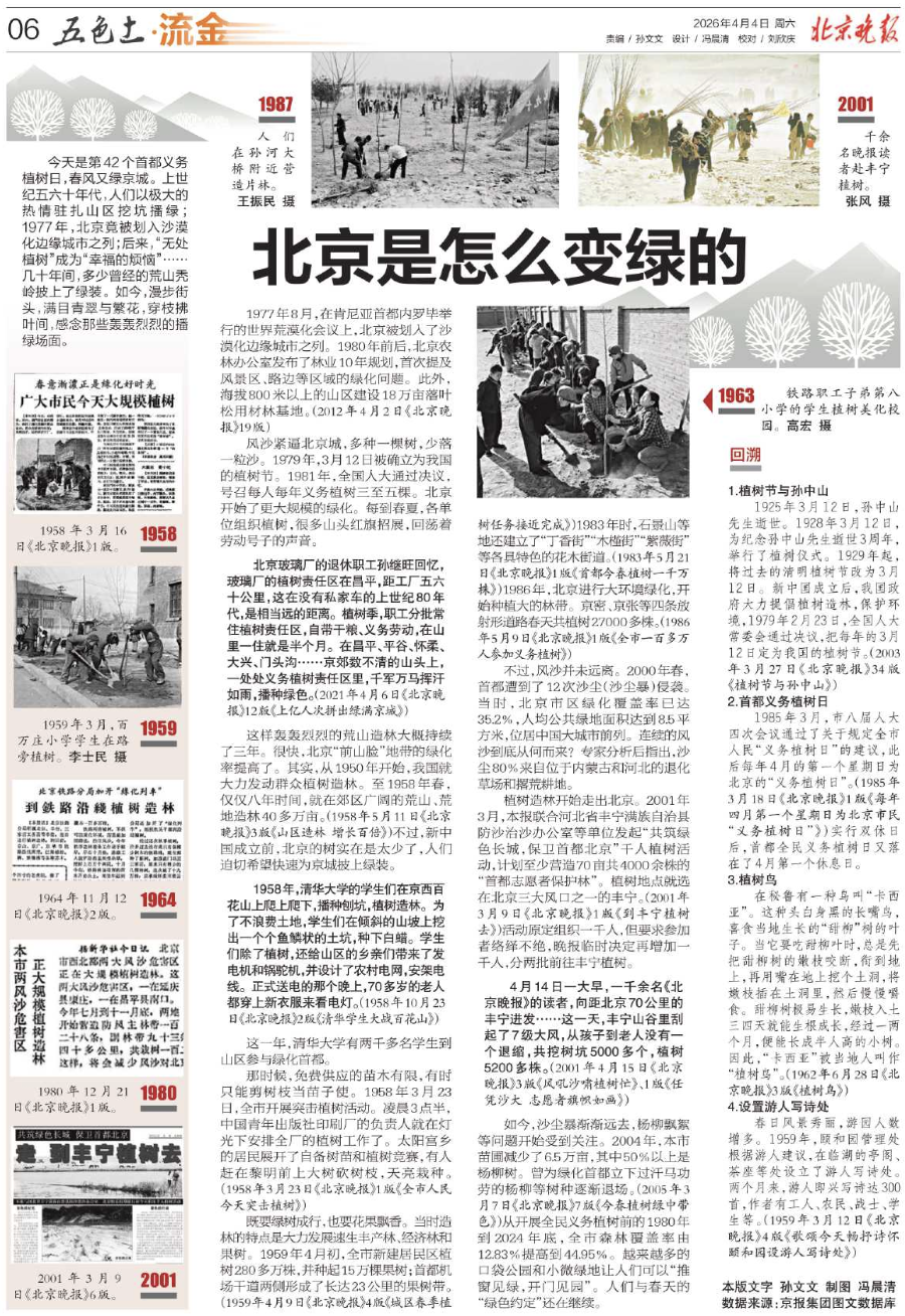今天是第42个首都义务植树日,春风又绿京城。上世纪五六十年代,人们以极大的热情驻扎山区挖坑播绿;1977年,北京竟被划入沙漠化边缘城市之列;后来,“无处植树”成为“幸福的烦恼”……几十年间,多少曾经的荒山秃岭披上了绿装。如今,漫步街头,满目青翠与繁花,穿枝拂叶间,感念那些轰轰烈烈的播绿场面。