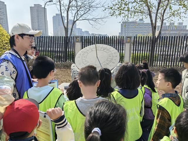 春日暖阳下,晷针在表盘上投下清晰的影子。孩子们戴着电子手表,学着用古老的计时工具——日晷识读时间。科技辅导员为孩子们讲解日晷的工作原理,带他们走到室内课堂,利用手电筒和小铁棍等简单工具,直观讲解北京地区太阳运动的规律。市民邱女士看着女儿认真地在学习单上记下知识点,不时举起手机,记录下她的成长瞬间。