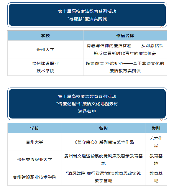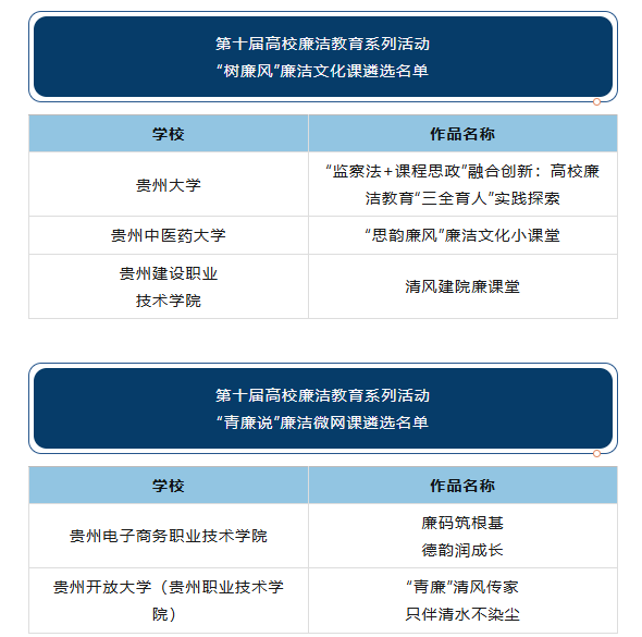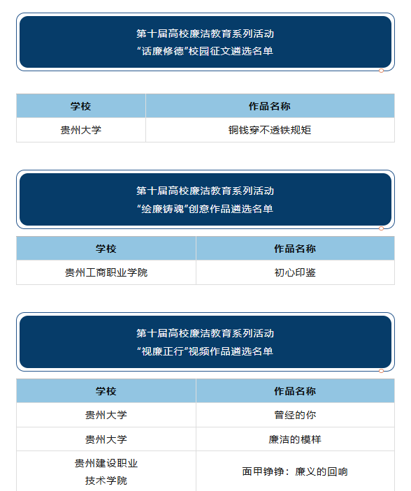 近日,教育部公布第十届高校廉洁教育系列活动结果,贵州省推荐的15件作品获评优秀作品,其中包括“话廉修德”校园征文作品1件、“绘廉铸魂”创意作品1件、“视廉正行”视频作品3件、“树廉风”廉洁文化课3件、“青廉说”廉洁微网课2件、“寻廉脉”廉洁实践课2件、“传廉促担当”廉洁文化地图素材3件。一起来看我省获奖名单——