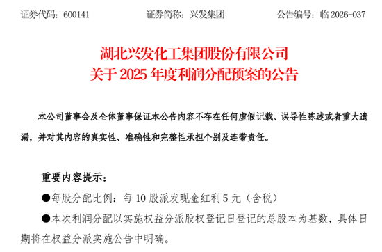 (600141)公告,公司拟向全体股东每10股派发现金红利5元(含税),预计派发现金红利5.98亿元(含税),占2025年度归属于上市公司股东的净利润比率为40.08%。