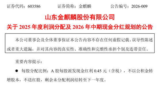 (603586)公告,公司拟向全体股东每股派发现金红利0.45元(含税)。截至2026年4月3日,公司总股本1.96亿股,以此计算合计拟派发现金红利8822.38万元(含税)。
